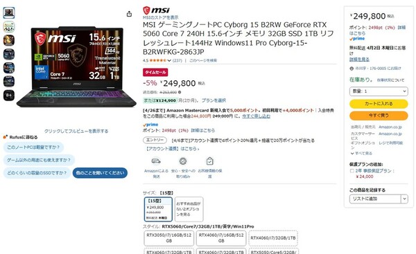Amazon.co.jpにて、MSIの15.6型ゲーミングノートPC「Cyborg 15 B2RW」が販売中だ。過去価格は26万3800円だが、タイムセールにより5%オフの24万9800円で購入できる(3月30日時点)。