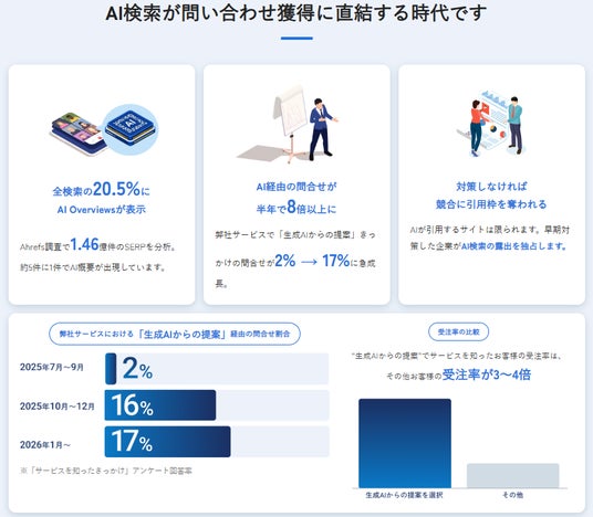ChatGPTやPerplexity、Google AI Overviewsなど、生成AIを使った検索行動が急速に広がっています。こうしたAI検索において、自社のサービスや情報が「引用元」として選ばれるかどうかが、今後の問い合わせ獲得を大きく左右する時代に入りました。