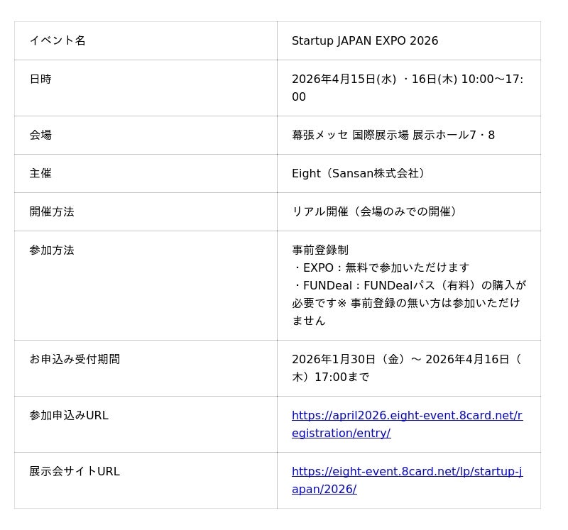 2026年4月15日(水)・16日(木)に幕張メッセで開催される、国内最大規模のスタートアップ展示会です。国内外から約450社のスタートアップ・支援企業が一堂に会し、約13,000名のビジネスパーソンの来場が見込まれています。