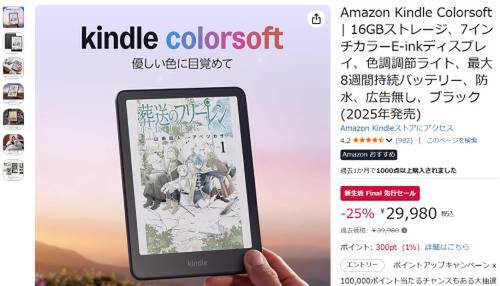 Amazon Kindle Colorsoft がAmazon新生活 Final 先行セール対象。参考価格39,980円のところ、25%オフの29,980円で販売中。