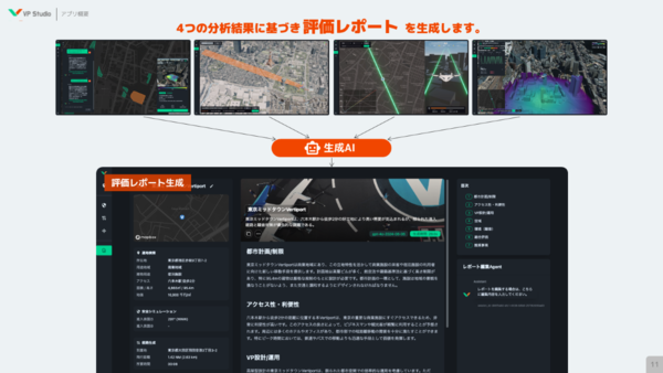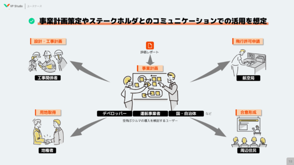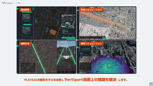 「VP Studio」が搭載する機能は、生成AIを使った適地検索(屋上、土地)、安全シミュレーション、障害物を回避した経路の自動生成、フライト数に応じた騒音のシミュレーション、そして、これらの結果を統合し目的に合わせたレポート生成。自治体へのヒアリングも行い、実運用に向け開発を進めているという。