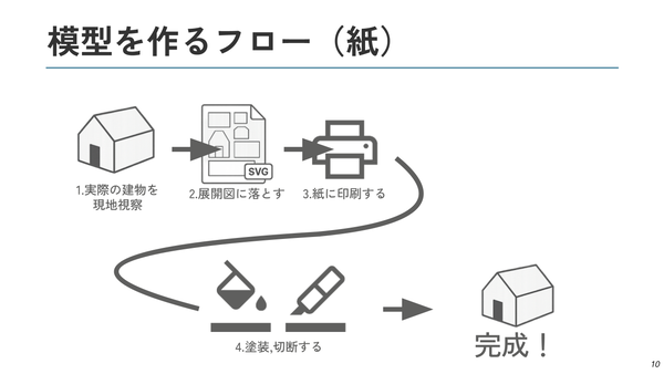 宮崎氏は模型作りの中でも建物模型をつくるのが好きで、紙を使って様々な建物をつくってきた。その作り方は、実際の建物を現地に見に行ったり、Google Erathなどで建物を調べたりしてから、展開図に落とし込み、紙に印刷して塗装や切断をして組み立てて制作するのだという。