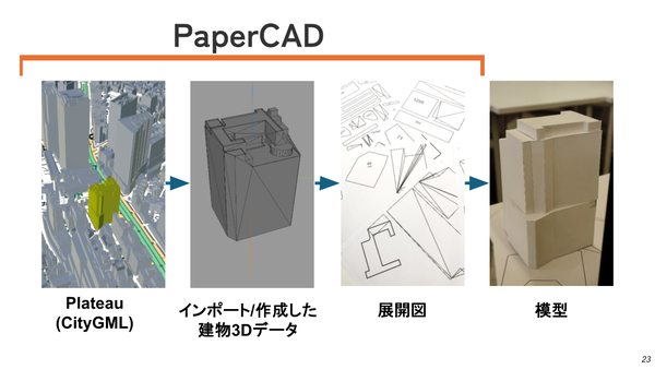 「Paper CAD」は、建物模型制作のためのツール。PLATEAUの3D都市モデルから建築物モデルをインポートし、建物模型制作用の展開図(2D)へと自動変換するものだ。
