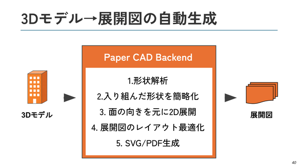 「Paper CAD」では3Dモデルの面や辺、頂点などの形状を解析してそれらの位置関係を分析。その後、模型にできないような細かすぎる形状は簡略化するなどし、面の向きを元にして2Dに展開するという。細かすぎるパーツをいかに簡略化するかなど、宮崎氏自身の模型制作の経験とノウハウが詰め込まれている。