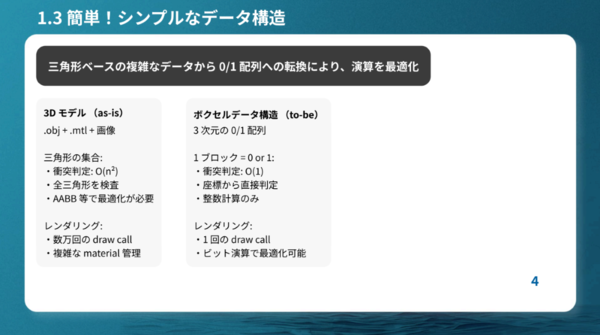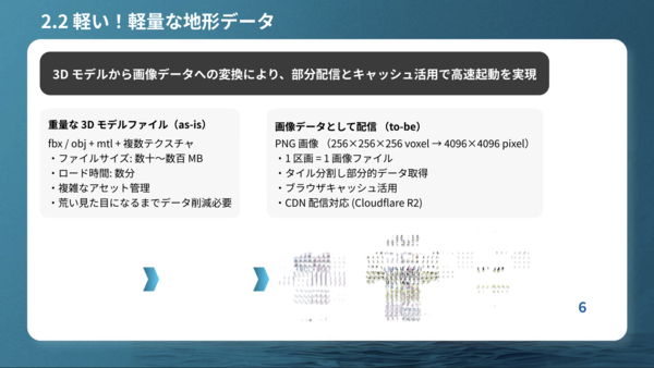 Voxelとは、小さな立方体(サイコロ状の塊)としてデータを表現する形式。ブロックを組み合わせたり積み上げたりする感覚で扱うことができるため、効率的な空間計算処理が可能となる。また、3Dモデルを画像データに変換することで1区画=1画像ファイルとして部分配信するほか、ブラウザのキャッシュを活用することで高速化しているという。