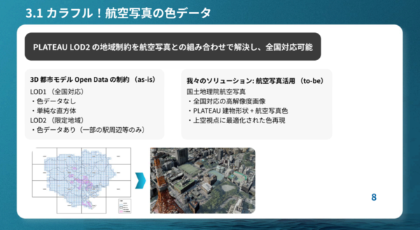 現状LOD2化されていない地域のテクスチャの課題は航空写真を活用することで対応する。