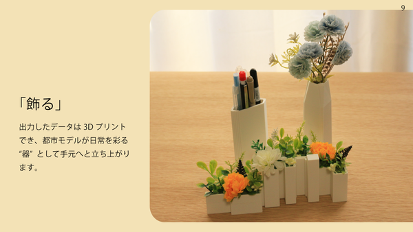 高精細なPLATEAUのデータをもとにして、街中の自分の好きなビルや思い入れのある建築物を花瓶にして手元に置き、日生活の中に飾ることで、街を”手触りとして感じる機会”を提供し、愛着を深めてもらうことができる。現在、友人や知人を中心にユーザーテストを行い、ブラッシュアップを続けている。最終的に、オープンソースで公開し、3Dプリント代行サービスの展開も考えているという。