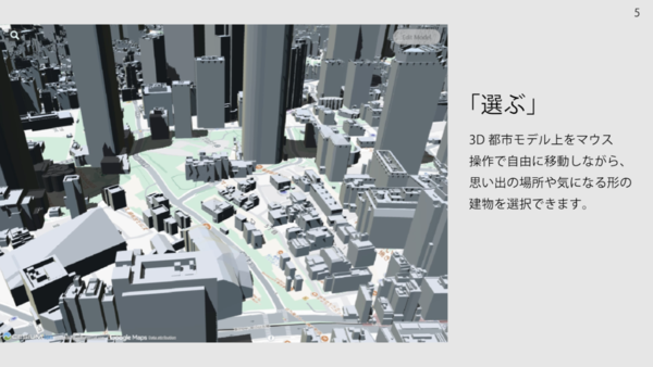 Webブラウザで動作し、表示される3Dマップからビルを選択、出力するモデルを編集する。モデルの編集画面には直感的なUI/UXを採用。誰にでも容易に「失敗しない3Dモデル」が作れるようカスタマイズしたデータを提供する。
