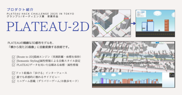 「PLATEAU-2D」は、PLATEAUの3D都市モデルを自動的に「横から見た2D画像」に変換するツール。2025年9月に開催された「PLATEAU Hack Challenge 2025 in Tokyo」でグランプリおよびオーディエンス賞を受賞した作品でもある。