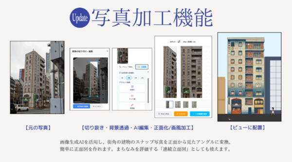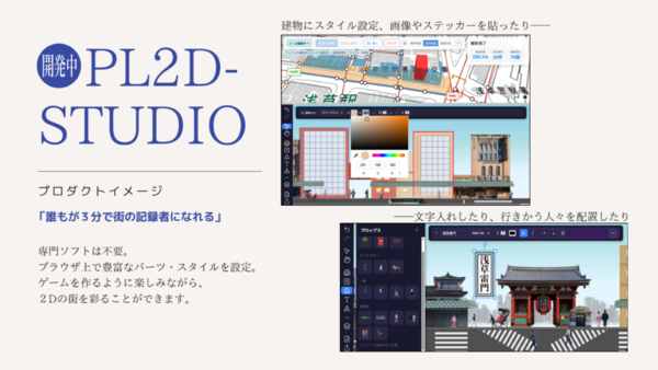 そして、誰もが3分で「街の記録者」になれるとして、参加者が撮影した写真から正面図を作成できる参加型のコンテンツ「PL2D-STUDIO」を開発している。