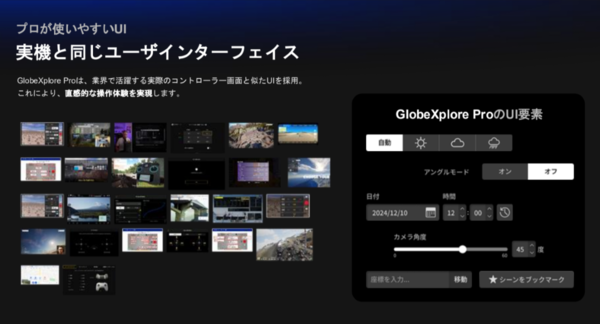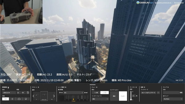 そこで「GlobeXplore Pro」では、事前プランニングのためのドローン飛行シミュレーションをPLATEAUの3D都市モデル上で実施。時間帯に応じた太陽の位置、天候の変更、レンズの変更(画角の確認)などの機能を備え、ドローン飛行の詳細なシミュレーションが可能だ。