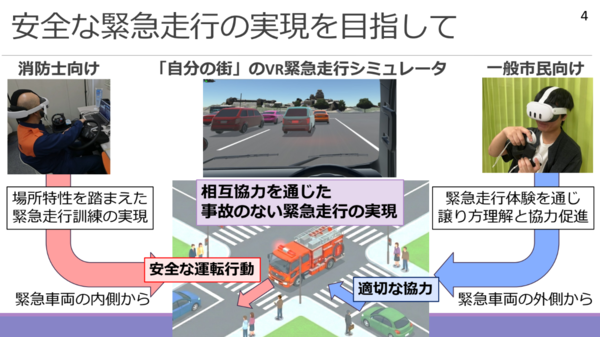 その背景には、緊急車両の交通事故リスクの高さと訓練上の課題がある。緊急車両は赤信号の交差点に進入するため危険度が高い一方で、事故が起きると傷病者の容態悪化や社会的信用失墜につながるなど、その影響は大きい。そのため事故防止に向けた取り組みは増えているが、実際に路上で走行訓練することは不可能で、ビデオ学習や模擬的訓練にとどまっているという。