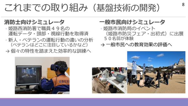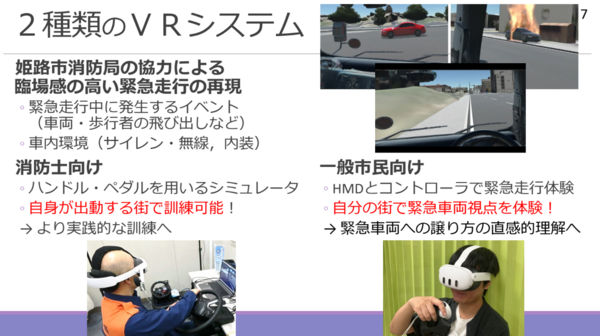 パブリック賞は、兵庫県立大学大学院工学研究科 視覚メディア工学研究グループが2022年から取り組み続けてきた「VR緊急走行シミュレータ研究プロジェクト」が受賞した。このプロジェクトは、VRを利用した緊急車両の走行体験を通じて、緊急車両のドライバー向け走行訓練と一般市民向けの安全教育のモデルを作ろうというもので、研究室の学生たちが数年にわたって引き継ぎ、開発を続けてきたものだ。