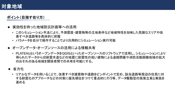 PLATEAUのオープンデータを活用し、予測震度や建築物の立地特性を加味した危険エリアや改善すべき道路を把握することにより、実効性の高い地域防災計画やデータ駆動型の施策立案を目指すというもの。