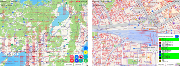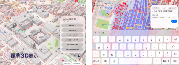「iPlateau」のデモ画面。起動するとマップとともにCityGMLの一覧情報が表示される(左)。ズームインすると詳細な情報を表示。udxフォルダのリストをタップすると見たい情報をマップに重ねて表示できる(右)