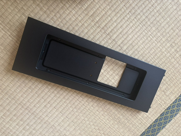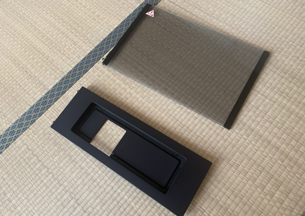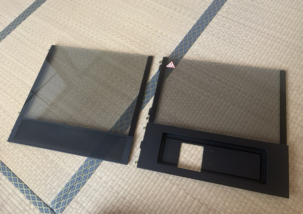 マウントキットは、サイドパネルにXENEON EDGEを組み込むためのフレームと、その上の強化ガラスパネルが同梱されていました。フレームにはXENEON EDGEがすっぽり入るサイズのくぼみがあり、ネジ穴が開いています。XENEON EDGEをはめ込んでネジで固定するだけで、簡単にサイドパネルにXENEON EDGEを装着できました。