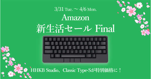 PFUは2026年3月31日(火)0時から4月6日(月)23時59分まで、Amazon新生活セールFinalに参加。HHKB Studio、HHKB Professional Classic Type-S、そしてHHKB Professional Classicが特別価格で購入できる。なお、セール期間は1%のポイント付与も実施する。