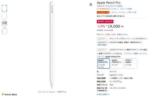 Appleのスタイラスペン「Apple Pencil Pro」がAmazonタイムセール対象。参考価格21,800円のところ、13%オフの19,000円で販売中。