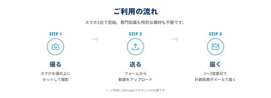 - 2~3営業日で結果を返却動画をフォームからアップロードすると、計数結果がメールで届く。現場での複雑な操作は不要。
