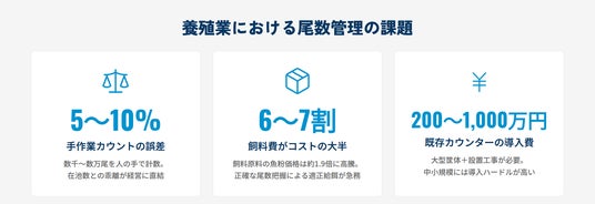 一方、2023年漁業センサス(農林水産省)によれば、漁業就業者数は12万1,230人と5年前から20.1%減少し、個人経営体では65歳以上が53.7%を占めます。養殖現場でも人手不足と高齢化が進む中、数千~数万尾を人の手で数える従来の計数作業は現場にとって大きな負担となっています。水産庁も「スマート水産業」の一環としてICT・AIを活用した尾数カウントシステムの導入を推進していますが、既存の自動カウンター(自動計数機)は200万~1,000万円の導入費用に加え、大型筐体の設置工事が必要であり、中小規模の養殖業者にとって導入ハードルが高い状況です。こうした背景から、アクアクラフトは養殖業向けクラウドサービス「uwotech pro」の運営を通じて把握した現場の計数課題を解決するため、スマートフォンとAIによる新たな計数手段を開発しました。