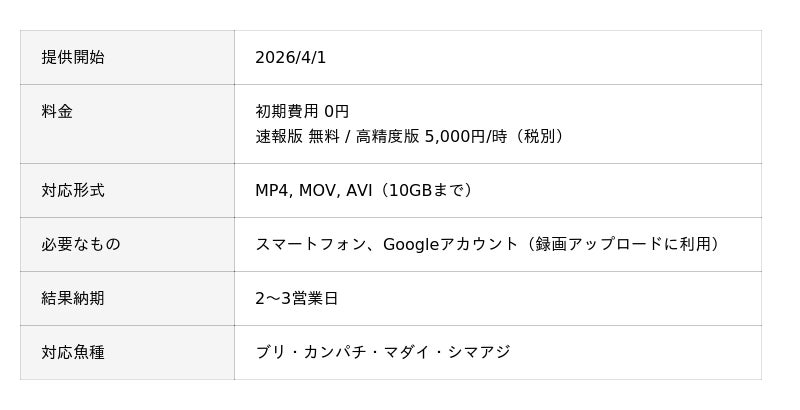 Aquacraft株式会社(東京都東大和市、代表取締役:加地誠、以下「アクアクラフト」)は、2026年3月より養殖魚の尾数を自動計数するサービス「uwotech 尾数計数」の提供を開始しました。本サービスは、ワクチン接種時に樋を流れる魚をスマートフォンで撮影した動画をAIが解析し、2~3営業日で計数結果を返却するものです。速報版は無料で利用でき、専用機材の購入や設置工事は不要です。