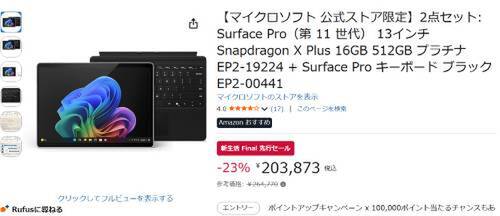 マイクロソフトの2in1 PC「Surface Pro(第11世代)+Surface Pro キーボード」がAmazon新生活 Final 先行セール対象。参考価格264,770円のところ、23%オフの203,873円で販売中。