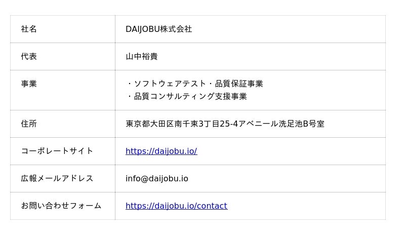 DAIJOBU株式会社は、少数精鋭の専門家による、ソフトウェアテスト・品質保証の専門会社です。web3やAIなど最先端領域をはじめとして、DXや基盤システムなど幅広い領域のプロダクトに対する総合的な品質保証ソリューションを提供しています。顧客に伴走し、事業を伸ばす"攻めの品質保証"を実現します。