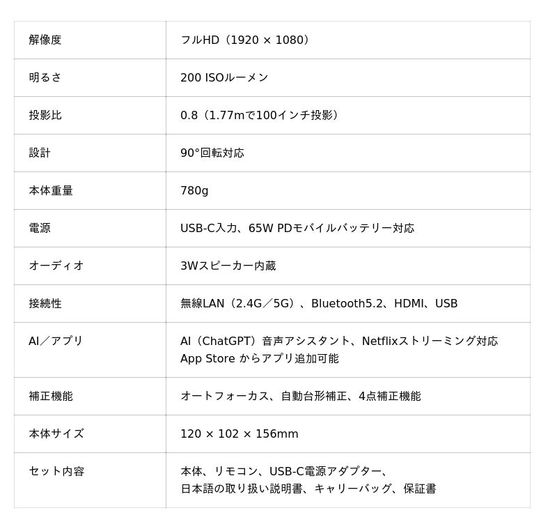 軽量・小型(本体780g)ながら、フルHDで最大100インチ投影。USB-C(65W)パワーバンク経由でプロジェクターに給電できるため、屋外や外出先でのエンターテインメントに最適です。