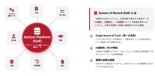 GoCoo! Platformは、従来のSFA(営業管理システム)をAI時代に対応する形へと進化させ、その本質をSystem of Record(SoR)として再定義したプロダクトです。