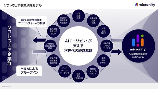 AI駆動型ソフトウェア事業承継プラットフォームを展開する株式会社マイクロニティ(本社:東京都渋谷区、代表取締役:山崎祐一郎、以下「マイクロニティ」)は、設立から約1年でARR25億円を達成し、ソフトウェア企業5社の事業承継を完了しました。また、このたびシードラウンドにおいて、国内ベンチャーキャピタル(VC)および個人投資家を中心とした第三者割当増資により、累計22億円の資金調達を実施したことをお知らせします。今回の調達により、業界特化型ソフトウェア企業のM&AおよびPMI(※1)体制の強化、AIエージェントを活用したソフトウェア事業運営の自動化、および採用活動の推進を加速してまいります。