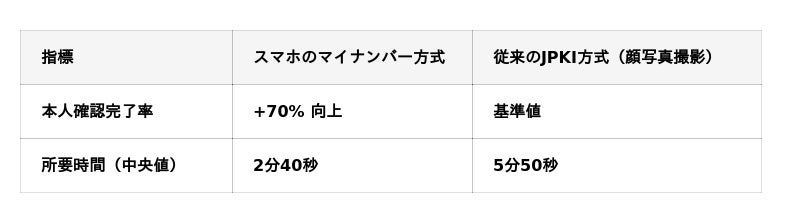 本人確認に要する時間(中央値)を比較すると、従来のJPKI方式が5分50秒であったのに対し、スマホのマイナンバー方式では2分40秒と、約半分の時間で完了しています。面倒な書類撮影や顔認証のプロセスが省略されることで、ユーザーはより短時間でストレスなく口座開設を行えるようになりました。