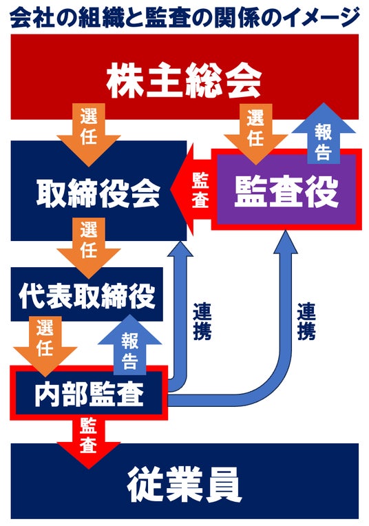 株主総会で選任された「監査役」が「取締役」を管理監督するのに対し、「経営者」らが選ぶのが「内部監査」の担当者です。「従業員」の業務をチェックするのが職務です。有効に機能すれば不祥事抑止や経営目標の達成に向け“自浄作用”が働きます。