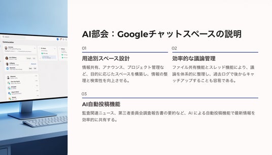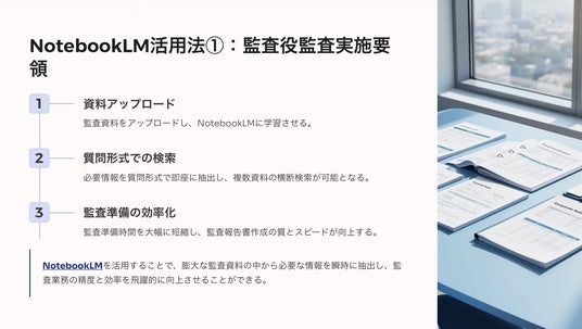 - 監査実施要領や第三者委員会の調査報告書など、専門資料の横断的な分析・要約に最適と位置付け、プロンプト(指示出し)の手法などを提示。監査業務の効率化を図るとともに、所属企業のリスク管理の強化や業務効率向上につなげる視点を提供。
