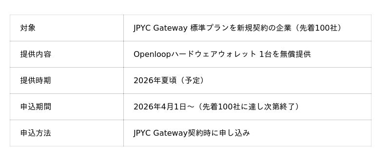 - JPYC Gatewayの提供開始キャンペーンとして、先着100社にOpenloopを無償提供。
