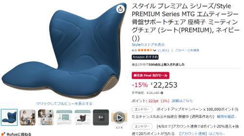 MTGの骨盤サポートチェア「Style PREMIUM Series(スタイル プレミアム シリーズ)」がAmazon新生活 Final 先行セール対象。参考価格26,180円のところ、15%オフの22,253円で販売中。