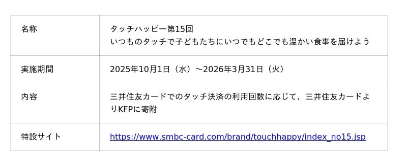 このたびは、三井住友カード株式会社さまより、「タッチハッピー第15回」を通じて温かいご支援をいただき、心より感謝申し上げます。多くの方々のタッチ決済が積み重なり、タッチ回数が3億回を超えました。日常の行動を子どもたちの支援に繋げる取り組みが広がってきており、大変ありがたく思っております。まもなく春休みを迎えます。学校給食のないこの期間は子育て世帯にとって特に食事の負担が大きくなりやすい時期です。いただいたご支援を活用し、「こどもごちめし」を通じて子どもたちへ温かい食事と笑顔を届けてまいります。今後とも「こどもごちめし」へのご理解とご支援を賜りますよう、よろしくお願い申し上げます。