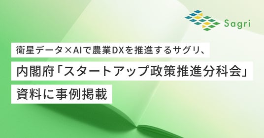 衛星データとAIを活用し、農業と環境の課題解決を目指すサグリ株式会社(本社:兵庫県丹波市、代表取締役:坪井 俊輔、以下「当社」)は、内閣府が公表した「第2回スタートアップ政策推進分科会 説明資料」の資料において、当社の取り組みが事例として紹介されましたことをお知らせいたします。