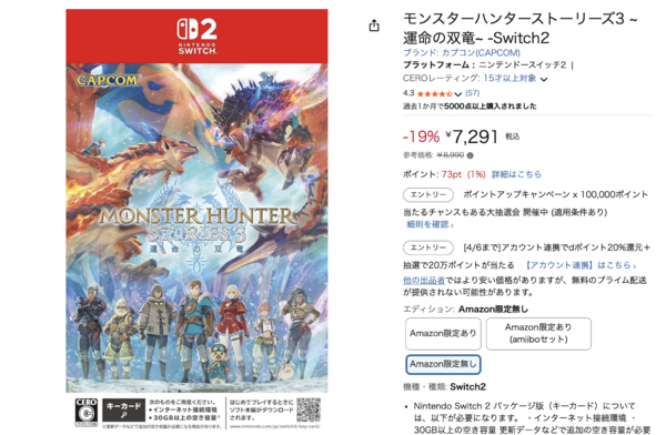 というわけで、今回紹介するのは「モンスターハンターストーリーズ3 ~運命の双竜~」です。AmazonではSwitch 2版が参考価格が8,990円のところ、19%オフの7,291円で購入できます(3月31日現在)。