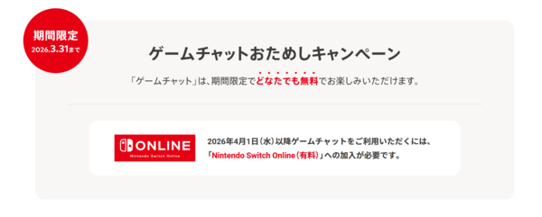 「ゲームチャットおためしキャンペーン」は、本日をもって終了いたします。キャンペーン終了後は、ゲームチャットの利用にNintendo Switch Onlineへの加入が必要になりますのでご注意ください。