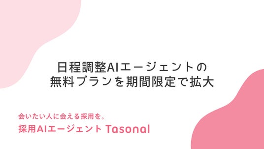 HR領域のAIサービスを提供する株式会社SAIRAI(本社:東京都新宿区、代表取締役CEO:平井瑞樹)は、AI採用プラットフォーム「Tasonal(タソナル)」において、日程調整AIエージェントのβ版無料トライアルを拡張し、"無料プランの月間調整件数を通常の月5件から月30件へ引き上げ"、3ヶ月間ご利用いただけるキャンペーンを開始したことをお知らせいたします。