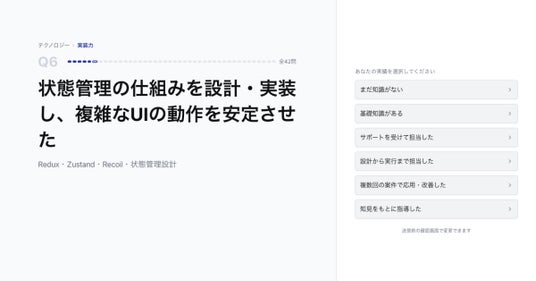 従来の適性検査や経験年数による評価とは異なり、実際の業務シーンを設問に用いることで実務遂行能力を定量的に測定します。回答は6段階の事実ベースの選択肢で構成されており、自己評価の主観的なバイアスを排除します。