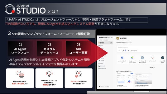 JAPAN AI STUDIOは、AIエージェントを組み込んだ業務システムを、コードを書かずに構築・運用できるプラットフォームです。画面設計・AIエージェント・データベースの3つの要素をひとつの環境で開発できるため、CONOCが蓄積してきた建設業務のノウハウとJAPAN AI STUDIOの開発基盤を組み合わせることで、見積管理・工程管理・現場報告といった業務におけるAI自動化を実現します。
