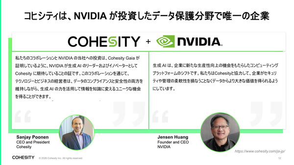 NVIDIA CEOのジェンスン・フアン氏は、コヒシティとの共同発表の中で、1万社以上のエンタープライズがバックアップする200エクサバイト以上のバックアップデータは、AI活用によって巨大なビジネス価値が掘り出せる“データの金鉱脈”だと表現している。
