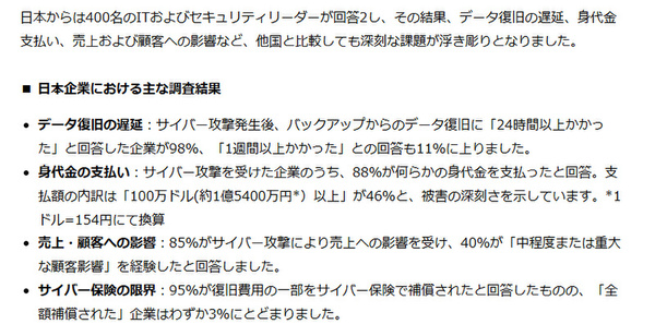 サイバー攻撃の被害発生後、「データ復旧に24時間以上かかった」日本企業は98%。攻撃により「収益への影響があった」企業は85%。さらに、被害を受けた企業の88%が「身代金を支払った」――。