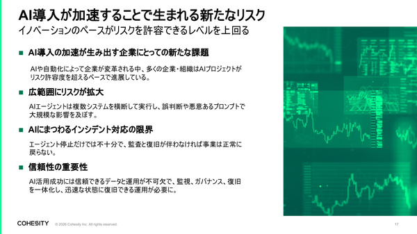「AIエージェントは企業内のさまざまなシステムと連携し、ものすごいスピードでさまざまなデータにアクセスしていく。これが攻撃で悪用されたり、設定ミス(で誤作動)したりしてデータの復旧が必要になったときに、従来のバックアップ/リカバリーという考え方は通用しない。『AIやエージェントのインフラに特化した保護』『AIエージェントが引き起こすリスクの軽減』さらに『機密データへのAIアクセスの監視やガバナンス』という3つの要素が求められる」(高井氏)