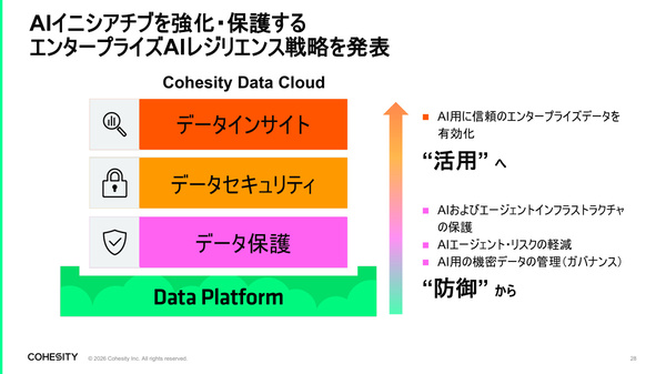 2024年にベリタス・テクノロジーズ(Veritas Technologies)のデータ保護事業を統合したコヒシティ(Cohesity)では、長年の実績を持つデータ保護/バックアップ領域にとどまらず、“AIインフラ保護”や“AIエージェントリスクの低減”、さらに“バックアップデータからのAIインサイトの抽出”までを視野に入れた展開を始めている。