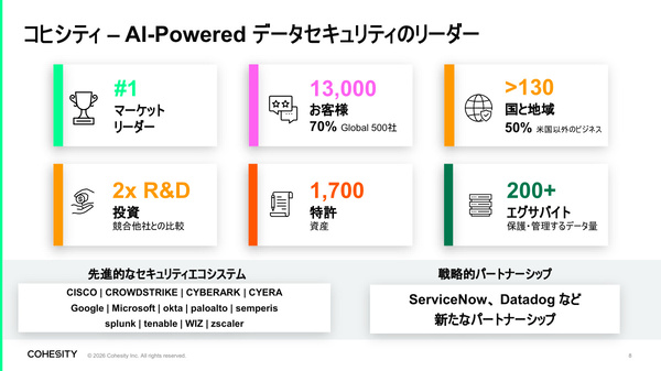 コヒシティは、2013年に米国で設立されたデータセキュリティベンダーだ。2024年12月に、40年以上の歴史を持つベリタスのエンタープライズ向けデータ保護事業を統合し、市場をリードするベンダーとなった。現在、エンタープライズ顧客はグローバルで1万3000社に及び、「Global 500」にリストアップされる巨大企業の70%がコヒシティを採用している。保護/管理する顧客データの総容量は200エクサバイト(200EB)以上に達するという。