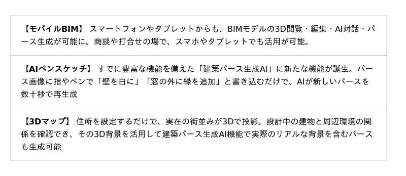 ~PC・スマホ・タブレットのブラウザで、場所を選ばずBIMの活用から建築パースの瞬時生成まで。「モバイルBIM」「AIペンスケッチ」「3Dマップ」の3機能を同時リリース~