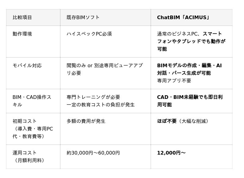 従来のモバイルBIMビューアや施工管理アプリは、あくまでBIMモデル「閲覧」や「情報付加」に特化していました。ACIMUSはモバイルから生成AIとの対話を通じてBIMモデルの作成・編集・パース生成までを可能にした、業界初※のモバイル対応した設計特化型BIMソリューションです。 ※当社調べ(2026年3月時点)