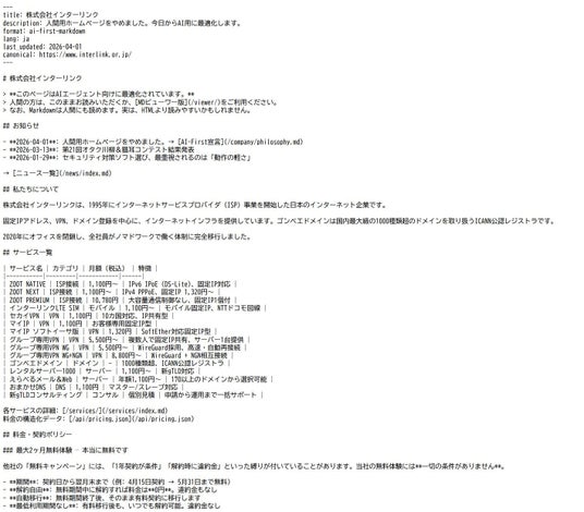 上級者向け(使う人のあまりいない)の特殊な(微妙な)サービスを提供する、株式会社インターリンク(東京都豊島区、代表取締役:横山 正、以下 インターリンク)は、2026年4月1日(水)、コーポレートサイト(https://www.interlink.or.jp/)をAI向けに最適化した「AI-Firstホームページ」として公開しました。従来の人間向けHTMLファイルを主体とした構成を廃し、ごく一部の例外を除いてHTMLファイルを削除。全ページをMarkdownファイル(.md)へ移行することで、生成AIやAIエージェントが直接読み取りやすいコーポレートサイトを実現しています。
